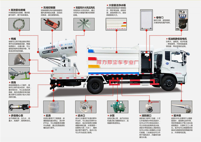 5、配套柴油发电机组供电安装在运输车辆上,操作灵活,使用安全可靠,遥控和人工控制操作,可随意控制调节水平旋转喷雾角度。